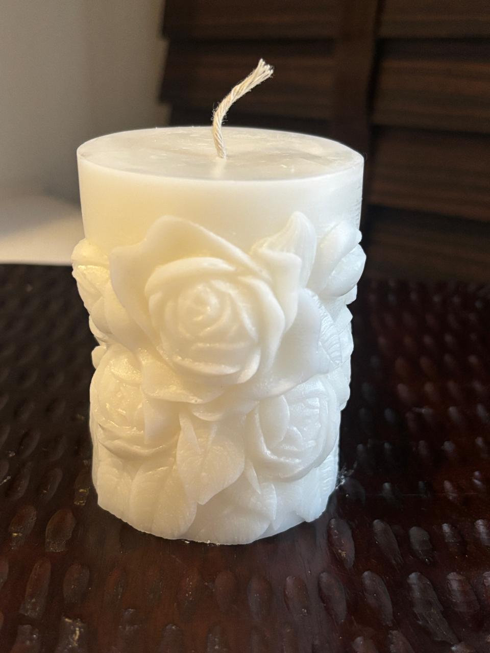 Molded candle with rose or floral patterns emphasize craftsmanship and premium quality